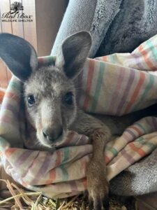 Pyrn (as in Pyrenees, pronounced Pirin) came into care at Red Box on the 26th July 2024, weighing just 1.2 kgs. Two women found a kangaroo lying across a narrow road just off the Pyrenees Highway. The kangaroo had been hit by a vehicle and was still alive. These wonderful women had one of the RBWS wildlife assistance kits in the car and at once pulled over to render assistance. They could see mum had a tiny joey in her pouch. While they were waiting for a wildlife rescuer a man pulled up behind their car and demanded they move out of the way as he was in a hurry. They explained the situation and were subjected to a torrent of abuse. The man angrily returned to his car and drove off around the mum, driving over her tail in the process.
